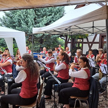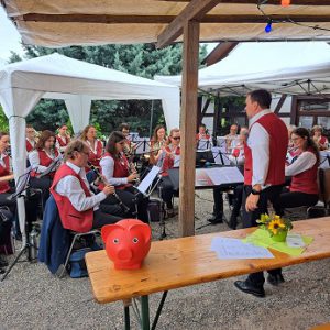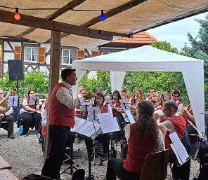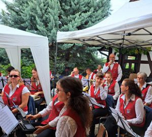 Wir präsentierten unser Sommer-Programm mit verschiedenen Solisten, neue und bekannte Stücke und einige Gesangsnummern. Unter anderem spielten wir einen „Jubiläums-Marsch“ zum 10-jährigen Jubiläum des Familien-Weinguts Renner, souverän dirigiert von Martin Renner.